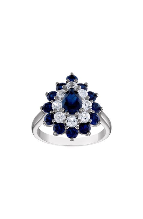Anillo doble halo de zafiro creado en laboratorio de plata de ley