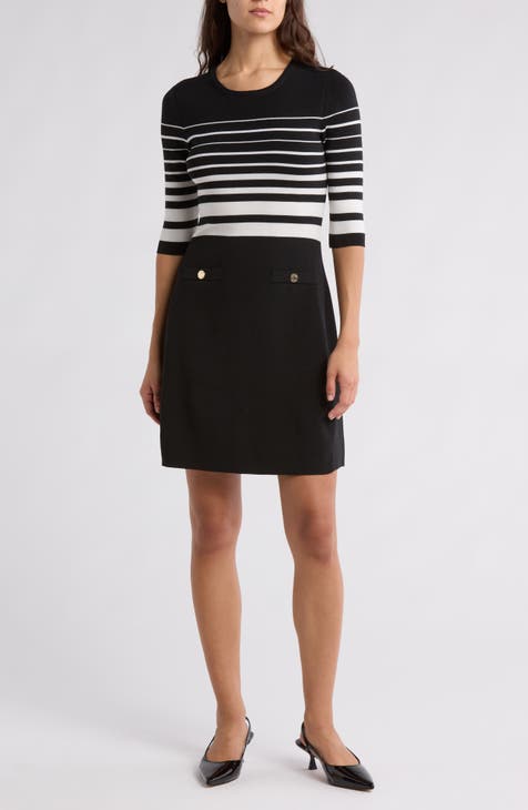 Vestido tipo suéter teñido de hilo con manga tres cuartos a rayas